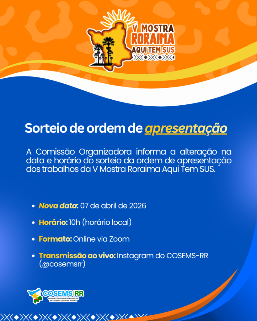 ERRATA_DO_SORTEIO_DE_APRESENTACAO_assinadoCOSEMS-RR publica errata com alteração na data e horário do sorteio da ordem de apresentação dos trabalhos da V Mostra Roraima Aqui Tem SUS. O sorteio será realizado no dia 07 de abril de 2026, às 10h, em formato on-line, com transmissão ao vivo pelo Instagram do COSEMS-RR. As demais informações do cronograma permanecem inalteradas.