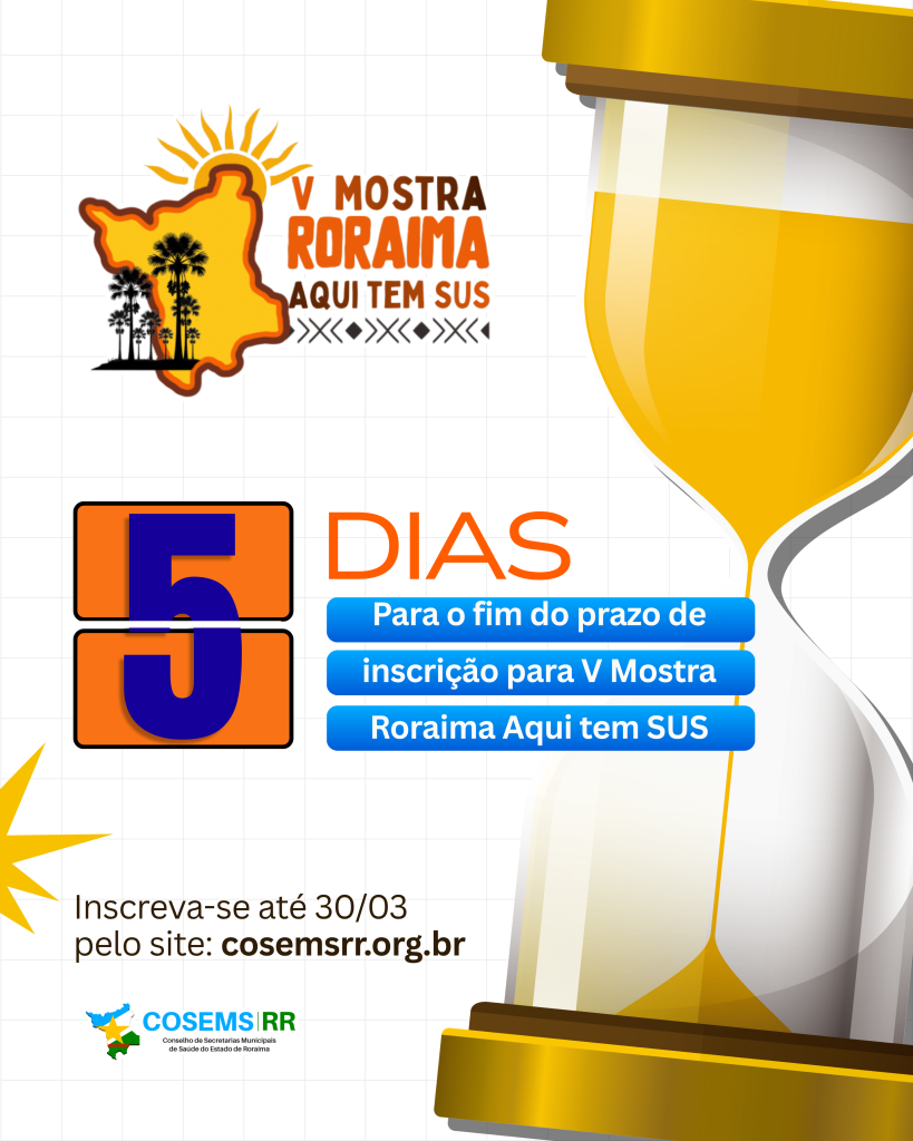 As inscrições para a V Mostra Roraima Aqui Tem SUS entram na reta final, restando apenas 5 dias para o encerramento do prazo. Profissionais, gestores e equipes da saúde têm até o dia 30 de março para garantir participação no evento.